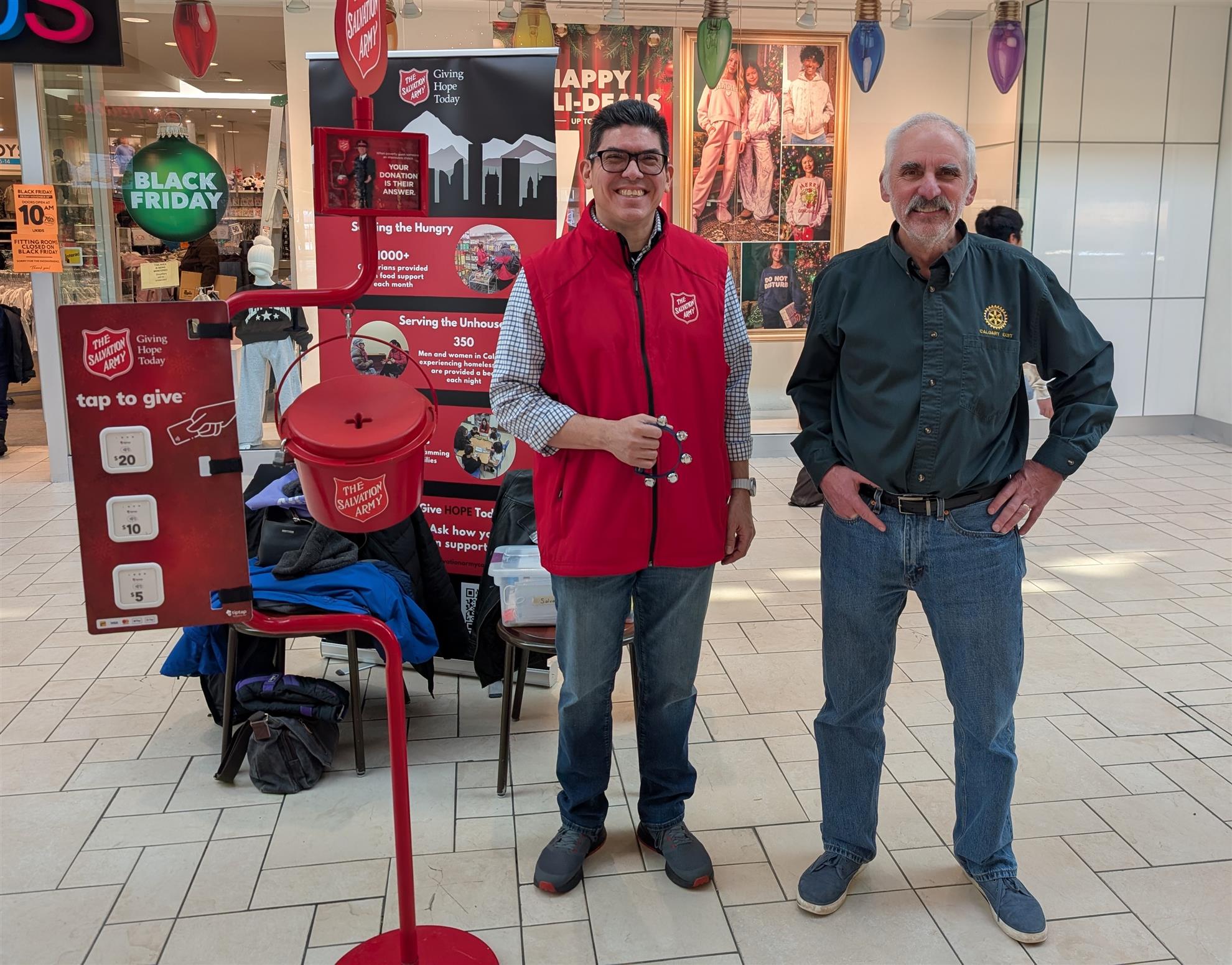 | The Rotary Club of Calgary East has supported the Salvation Army Kettles for many years and did so again this year. 11 volunteers covered shifts at the Marlborough Mall on November 22 and 23. |